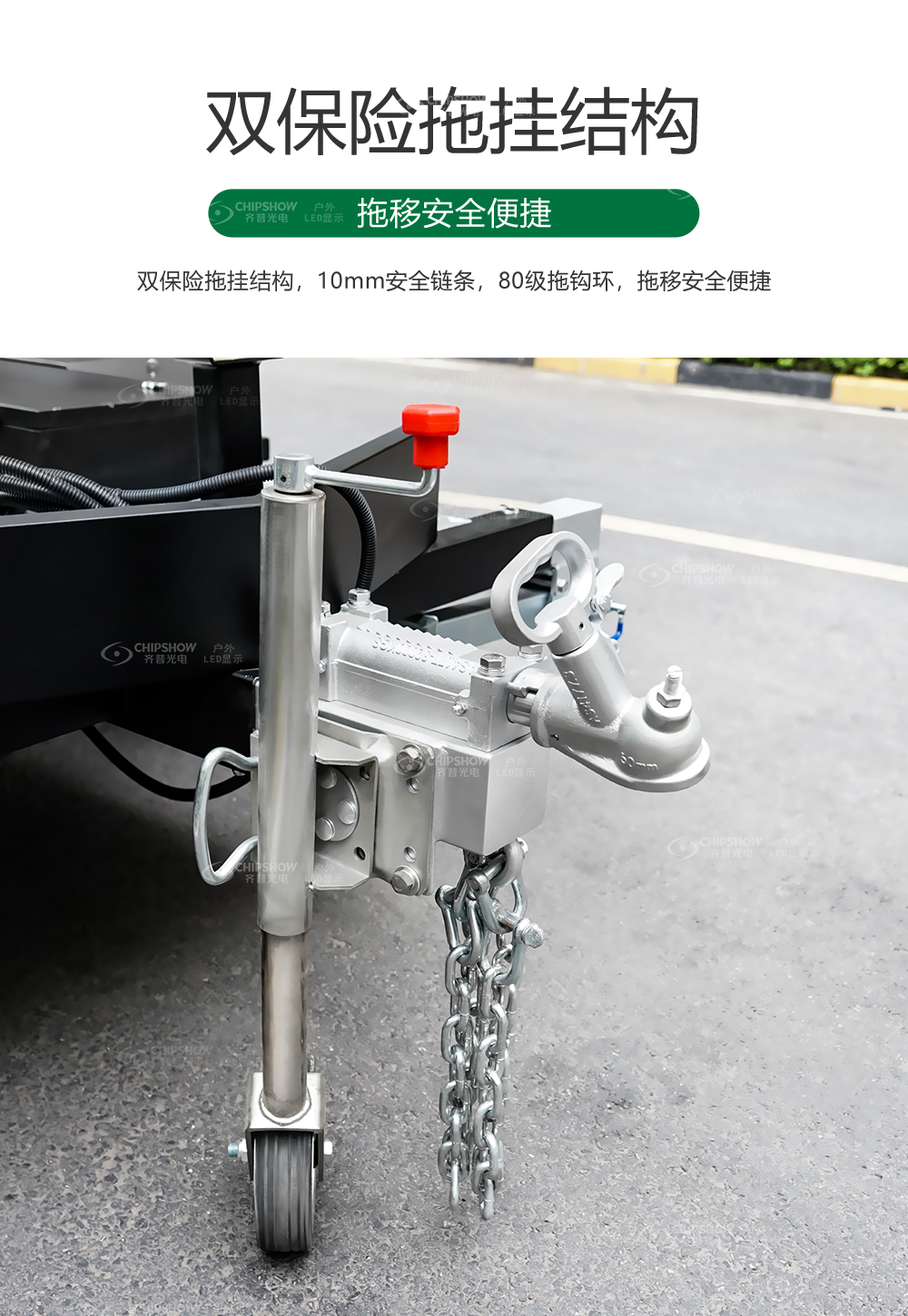 双保险拖挂结构,10mm安全链条,80级拖钩环,拖移安全便捷。